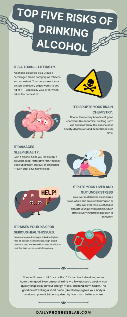 If you’re considering trying a 30-day no alcohol challenge (dry January or not), or you’re just sober curious and want to see what happens when you stop drinking, this is for you. I’ll share why I quit drinking for 30 days, how I motivated myself, what I learned, and the surprising outcomes (spoiler: not all are what you’d expect).