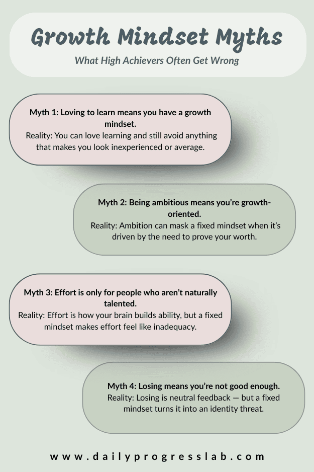 - Many high achievers mistake ambition and constant achievement for a true growth mindset.